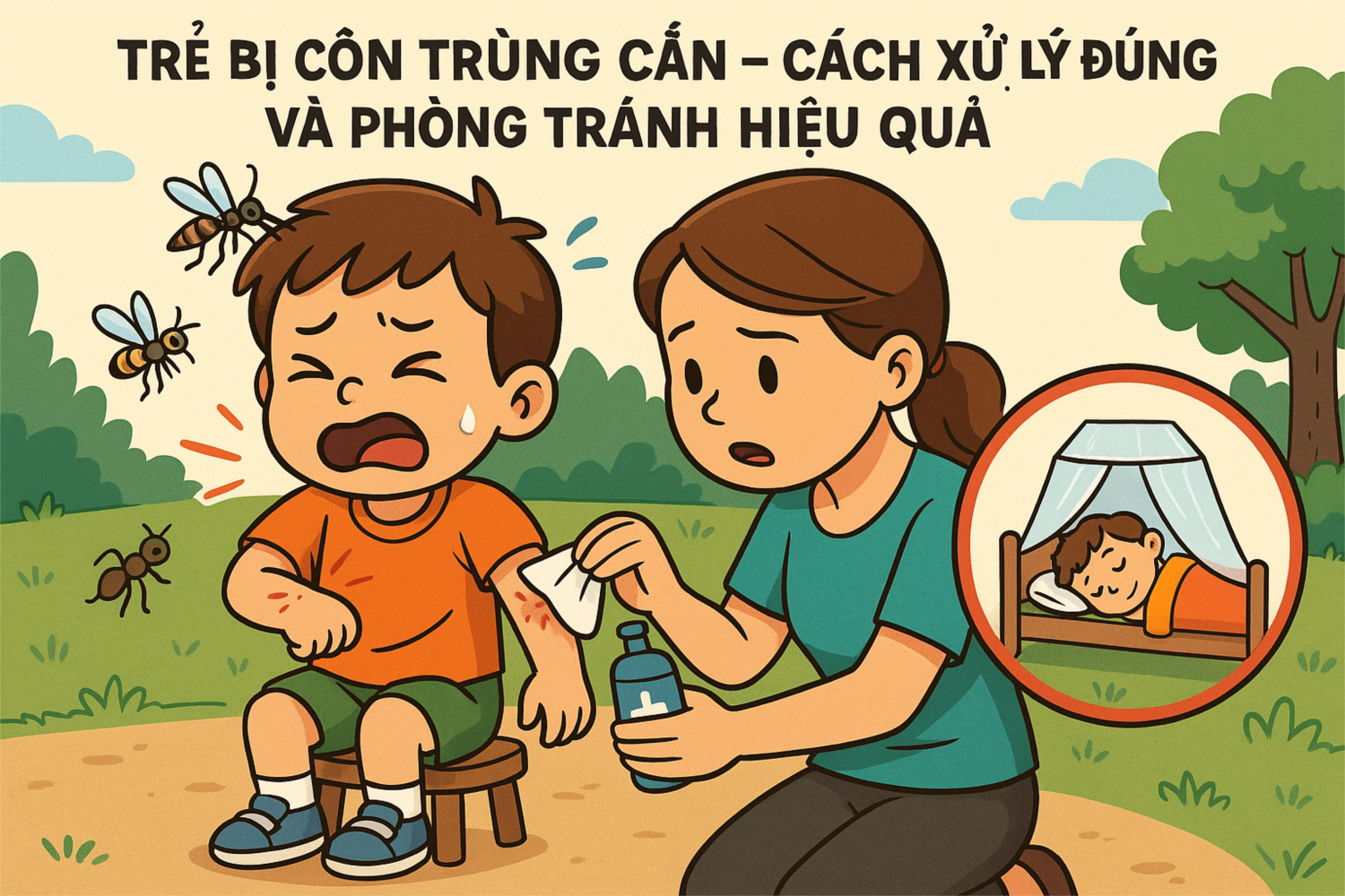 Ngay khi phát hiện trẻ bị côn trùng cắn, cha mẹ nên làm sạch vùng da bằng xà phòng và nước sạch, chườm lạnh để giảm sưng và ngứa. Có thể dùng kem chống dị ứng dành cho trẻ em, nhưng nếu trẻ bị sưng to, sốt hoặc nổi mẩn nhiều nơi, cần đưa đi khám ngay.