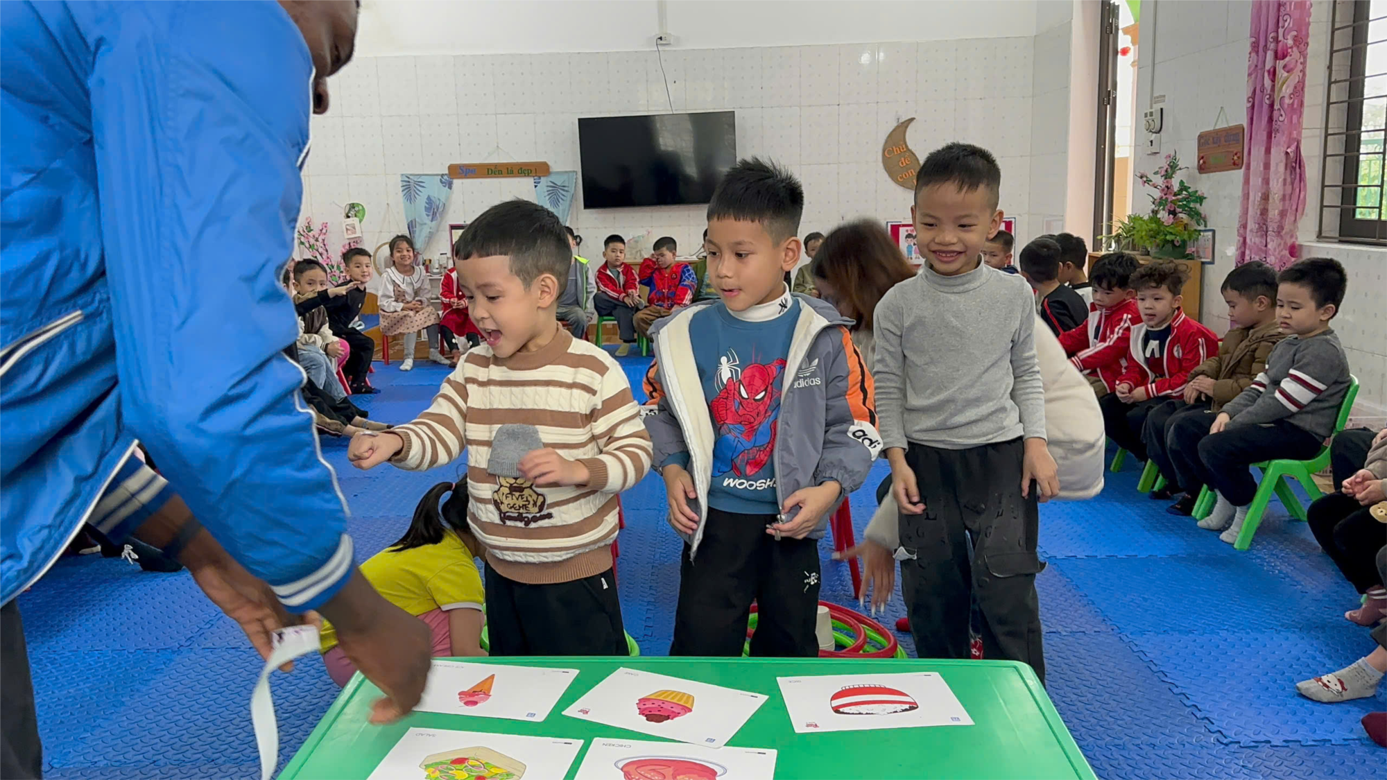 Thông qua việc chơi, giao tiếp với bạn bè, thầy cô, ngôn ngữ được trẻ tiếp thu một cách chủ động và dễ dàng