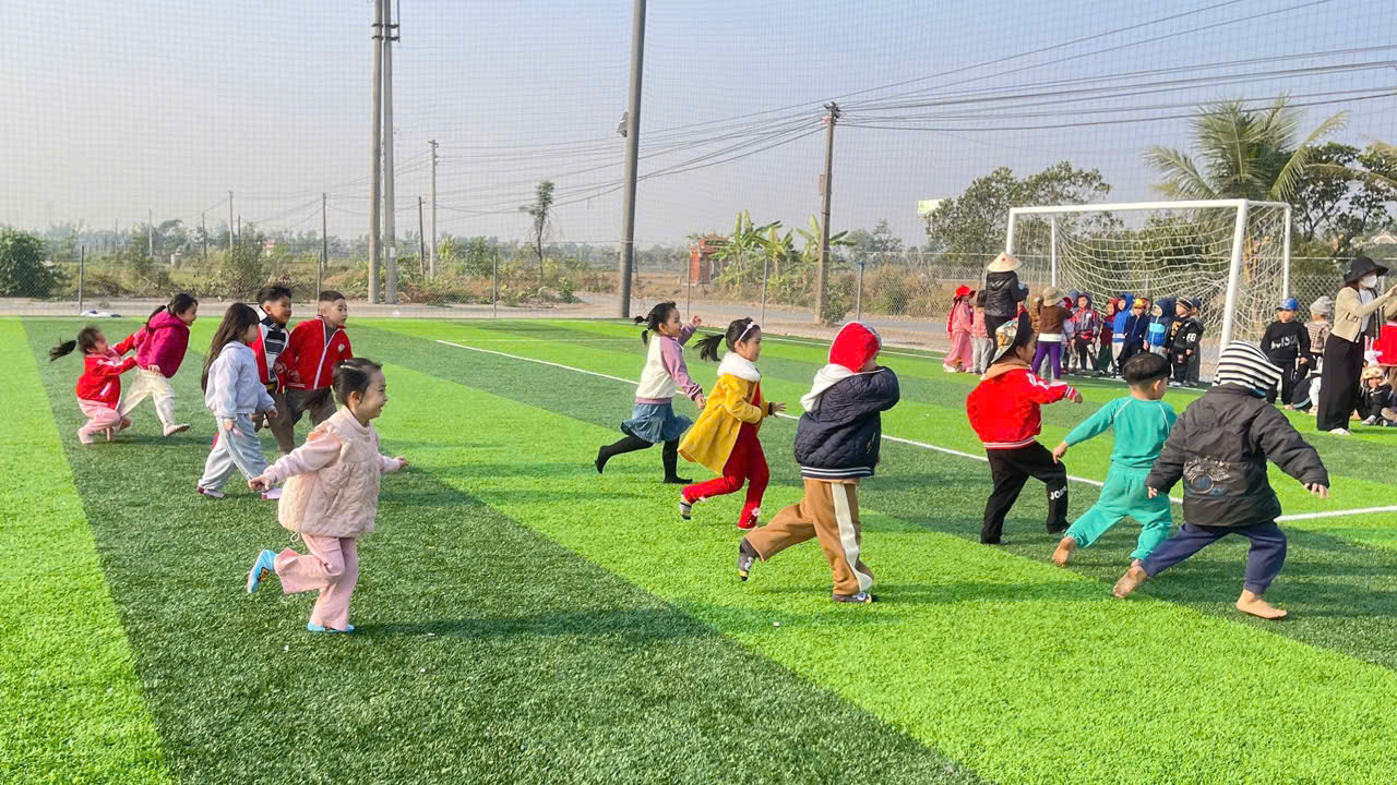 Nhằm hướng tới Ngày hội thể thao cấp Huyện, các trường trong cụm Quốc Tuấn đang tích cực tập luyện tại sân vận động Quang Trung. Không khí nơi đây tràn đầy năng lượng và tinh thần quyết tâm khi các vận động viên nhí hăng say rèn luyện với các môn thi đấu như đá bóng, nhảy bao bố, kéo co, và đẩy xe.