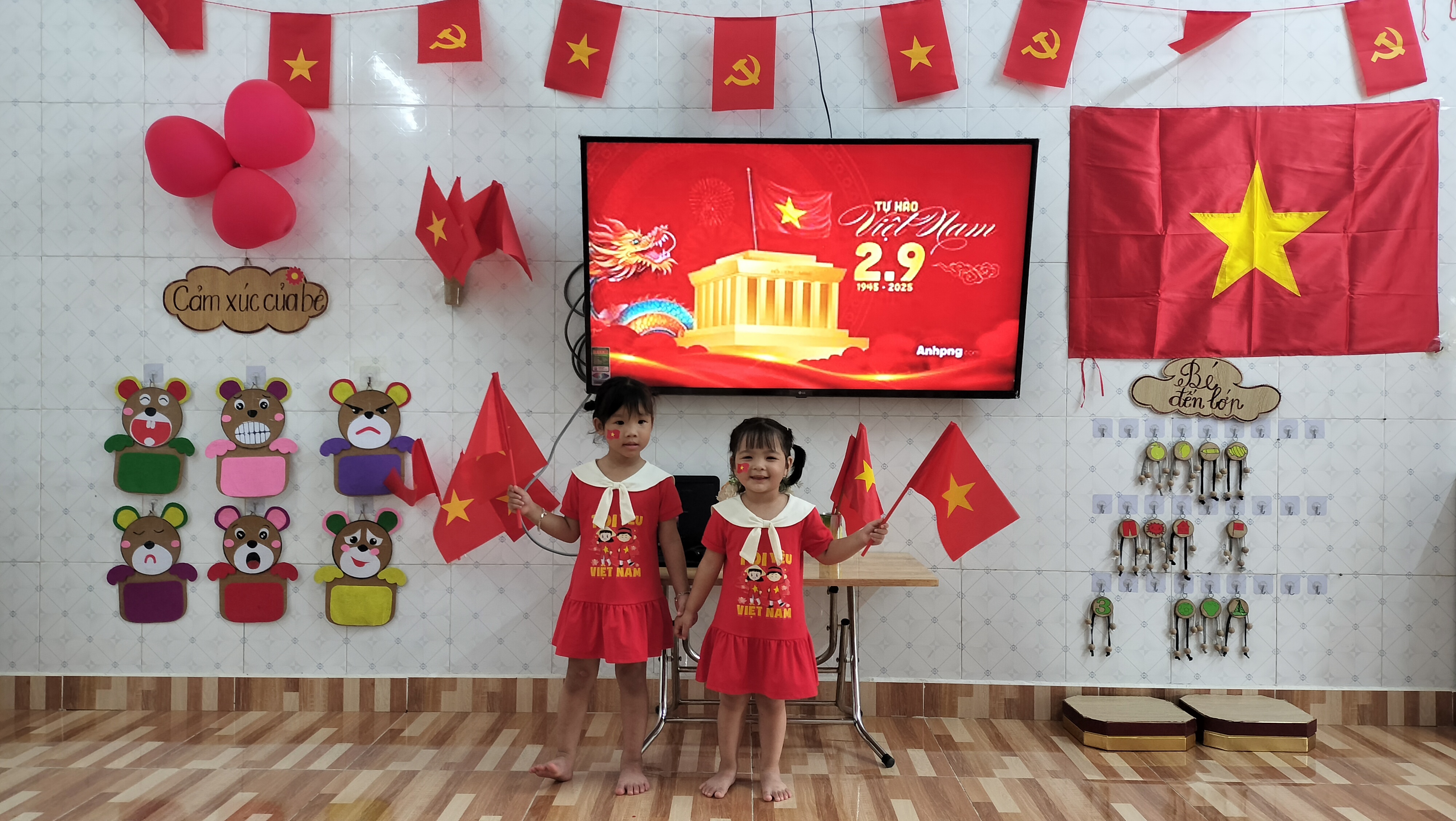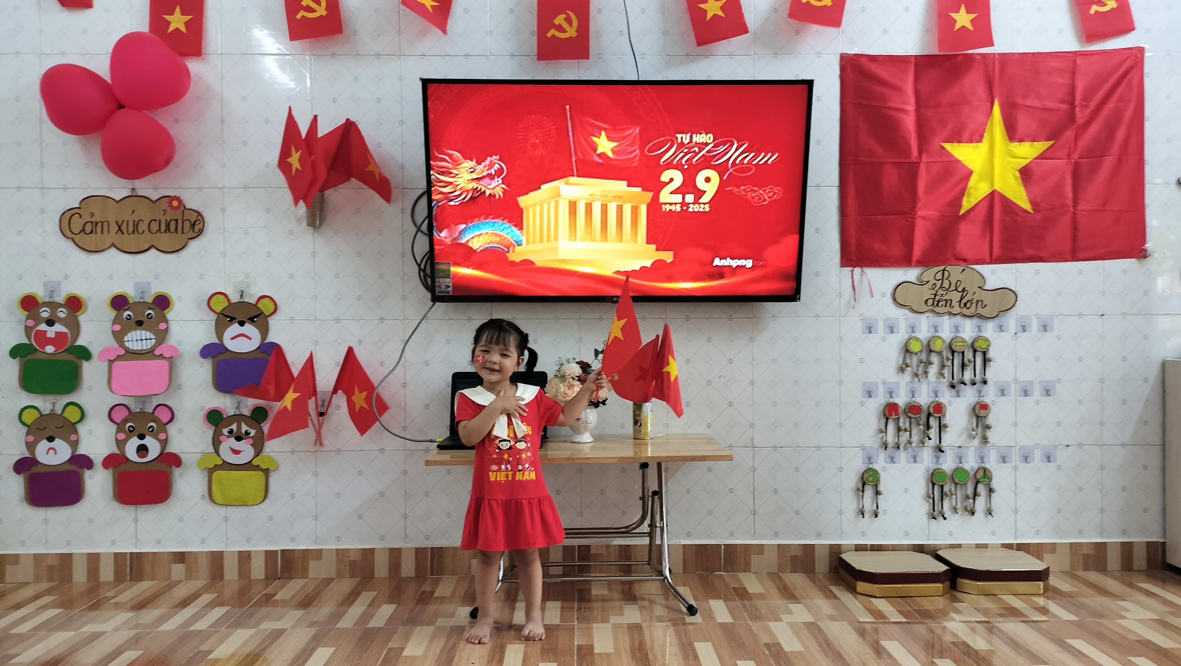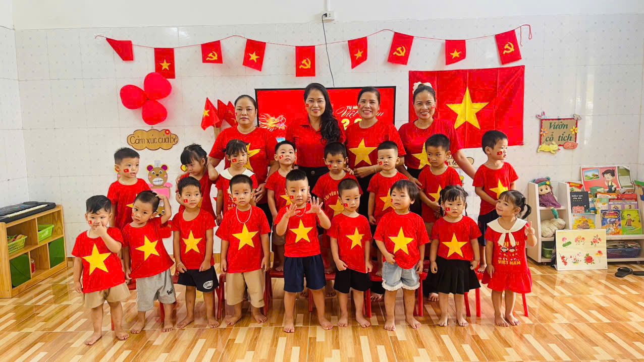 Đây là ngày hội lớn của dân tộc, là niềm tự hào của mỗi người dân Việt Nam. Hòa chung không khí vui tươi ấy, cô và trò lớp 3C3 – Trường Mầm non Quang Trung cùng nhau:Trang trí lớp học bằng cờ đỏ sao vàng rực rỡ.