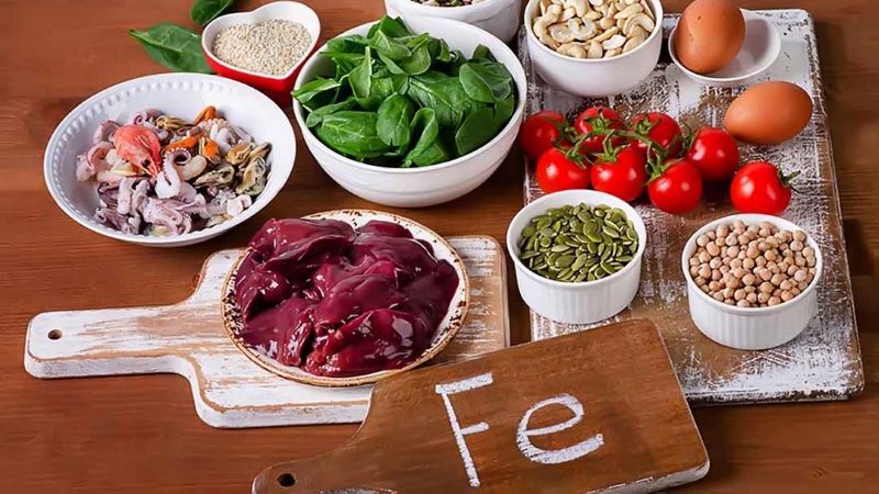 Sắt có trong hai nguồn chính: sắt heme (dễ hấp thụ) có trong thịt đỏ, gan, cá, trứng; và sắt non-heme (hấp thụ kém hơn) có trong đậu, rau lá xanh, ngũ cốc nguyên cám. Để tăng khả năng hấp thụ sắt, nên kết hợp với thực phẩm giàu vitamin C như cam, quýt, cà chua.