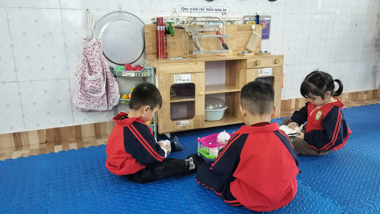 Các đồ dùng đồ chơi ở các góc được các bé lau chùi cẩn thận