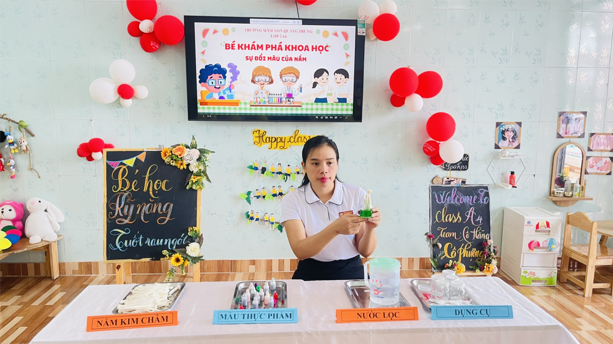 Cô giáo Trịnh Thị Phượng giới thiệu một số nguyên vật liệu cần có để thực hành thí nghiệm