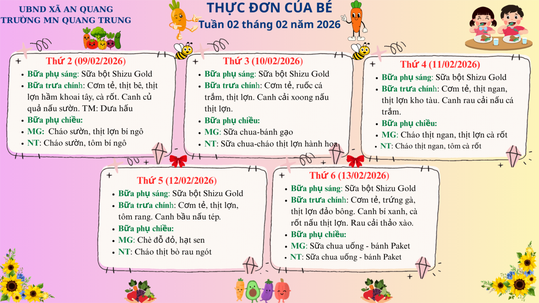 Kính gửi các bậc phụ huynh thực đơn của bé tuần 02 tháng 02 năm 2026. Thực đơn của nhà trường được xây dựng khoa học, phù hợp với từng độ tuổi, đảm bảo đầy đủ dinh dưỡng và an toàn thực phẩm. Các bữa ăn được thay đổi thường xuyên, giúp trẻ ăn ngon miệng và phát triển khỏe mạnh.