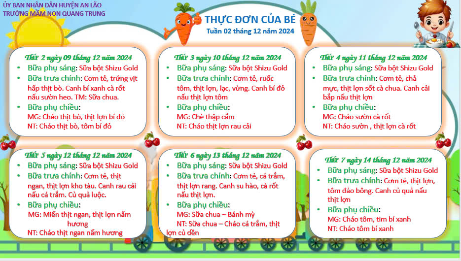 Tuyên truyền thực đơn của trẻ mầm non đến các bậc phụ huynh đóng vai trò rất quan trọng, nhằm nâng cao nhận thức của phụ huynh và giáo viên về việc cung cấp dinh dưỡng hợp lý, đảm bảo sự phát triển toàn diện cho trẻ. xin trân trọng giới thiếu thực đơn tuâng 2 tháng 12 năm 2024 của các bé trường Mầm non Quang Trung.