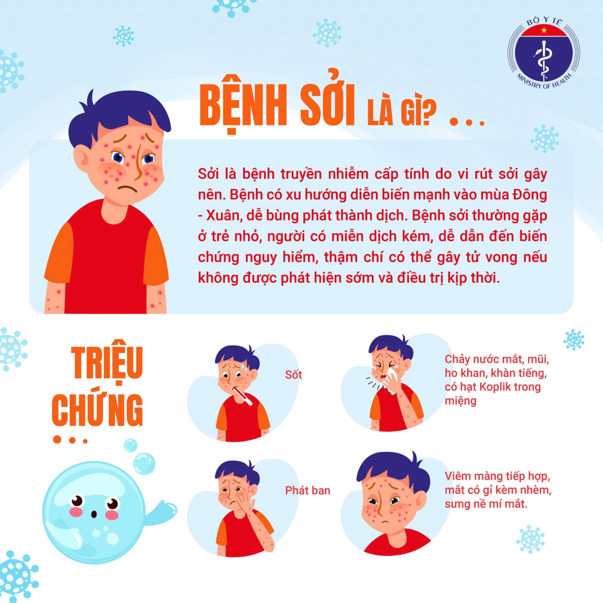 Sởi là bệnh truyền nhiễm cấp tính do vi rút sởi gây nên. Bệnh có xu hướng diễn biến mạnh vào mùa Đông - Xuân, bùng phát thành dịch. Bệnh sởi thường gặp ở trẻ nhỏ, người có miễn dịch kém, dễ dẫn đến biến chứng nguy hiểm, thậm chí có thể gây tử vong nếu không được phát hiện sớm và điều trị kịp thời.