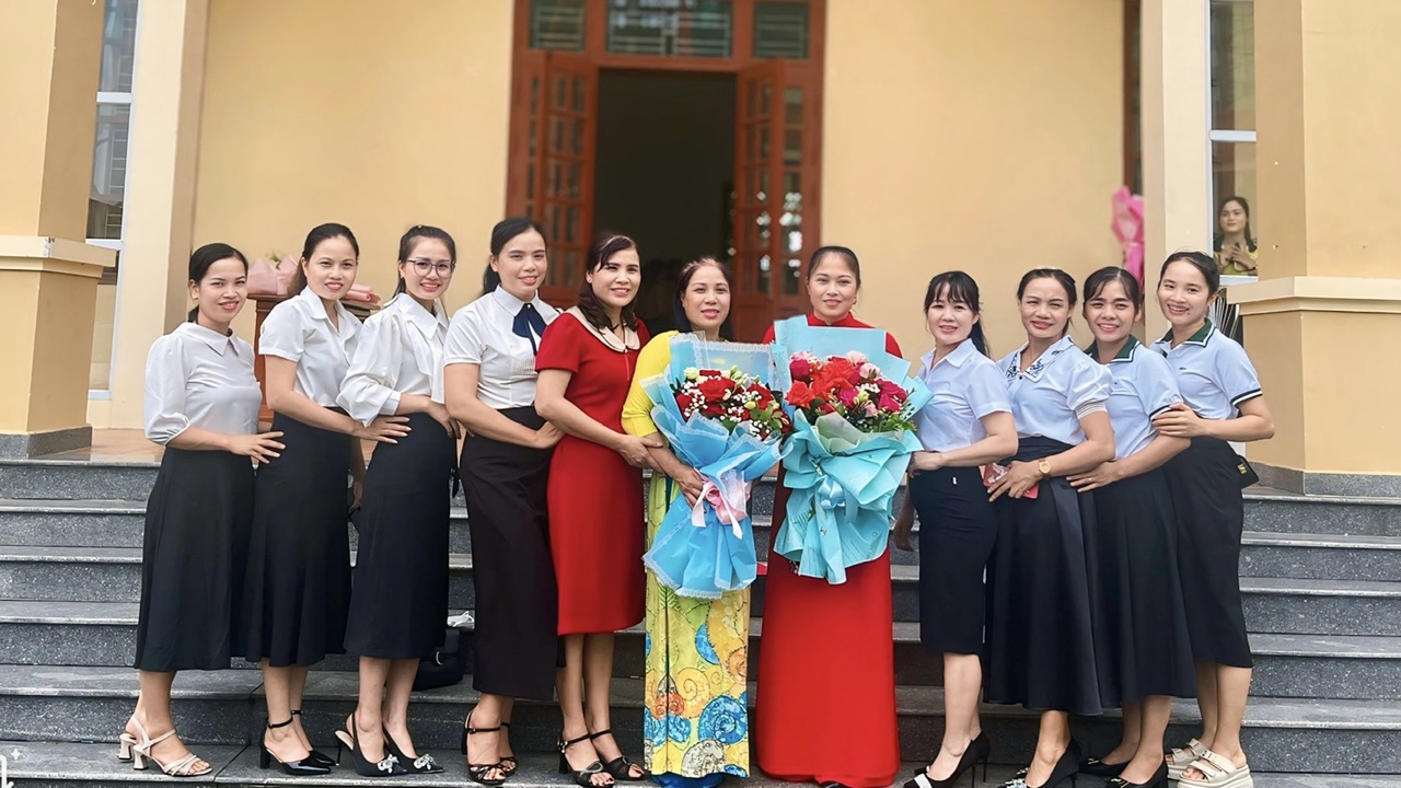 Đ/c Lê Thị Duyên tân PHT MNQT và đồng Chí Đỗ Thị Huệ nguyên PHT MNQT chụp ảnh cùng các đồng chí BGH và tổ khối trường MN Quang Trung