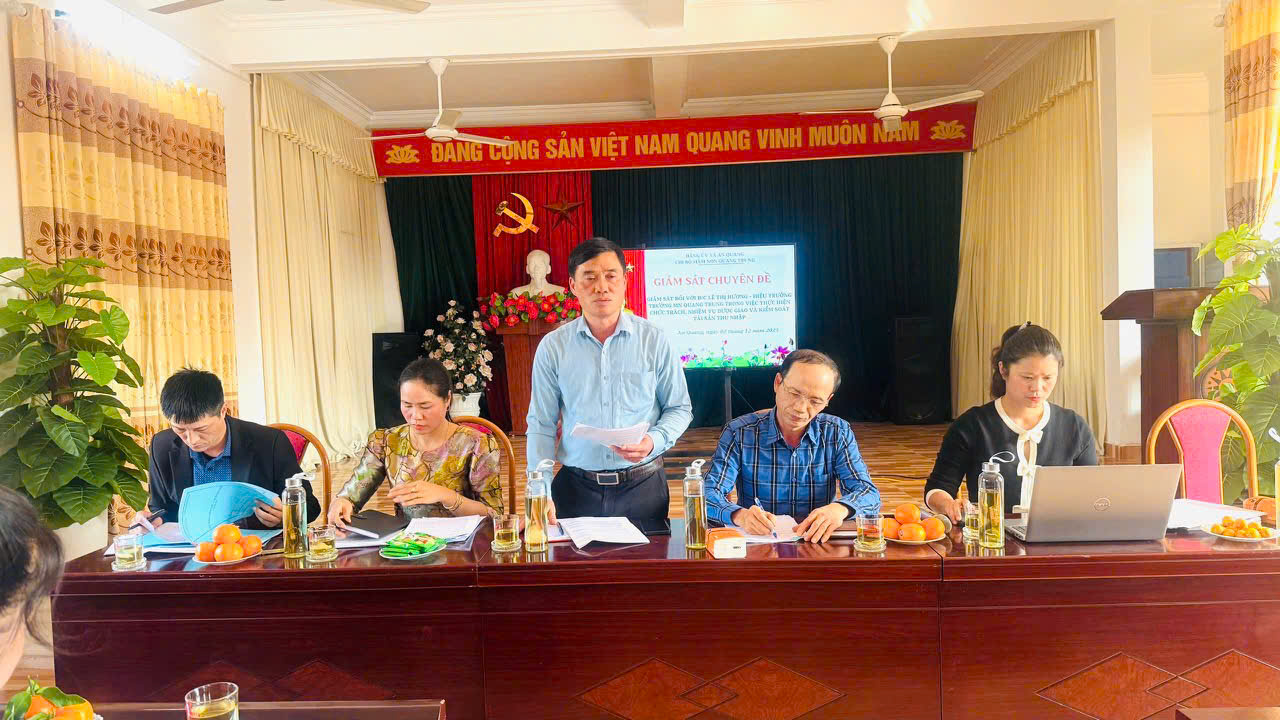 Thực hiện Quy định số 296-QĐ/TW của Ban Chấp hành Trung ương và chương trình kiểm tra, giám sát năm 2025, ngày 03/11/2025, Quyết định số 09-QĐ/UBKTĐU Chiều ngày 02/12/2025 Ủy ban Kiểm tra Đảng ủy xã An Quang ban hành giám sát đồng chí Lê Thị Hương – Bí thư Chi bộ, Hiệu trưởng Trường Mầm non Quang Trung trong thực hiện chức trách, nhiệm vụ và kiểm soát tài sản, thu nhập.