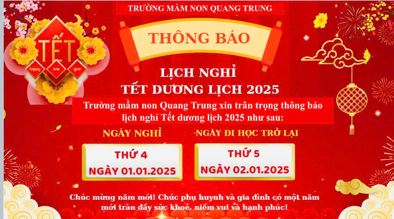 Nhà trường xin trân trọng thông báo lịch nghỉ Tết Dương lịch 2025 như sau:
