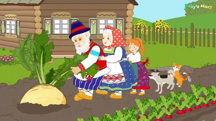 Mèo con gọi Chuột nhỏ: 'Chuột nhỏ ơi! Mau lại đây! Mau giúp tôi nhổ củ cải!' Chuột nhỏ chạy đến, bám đuôi Mèo. Mèo cắn đuôi Chó, Chó nắm biếm tóc cháu gái, cháu gái kéo áo bà, bà túm áo ông, ông nắm cây cải. Kéo mãi, cuối cùng cây cải cũng nằm trên mặt đất.